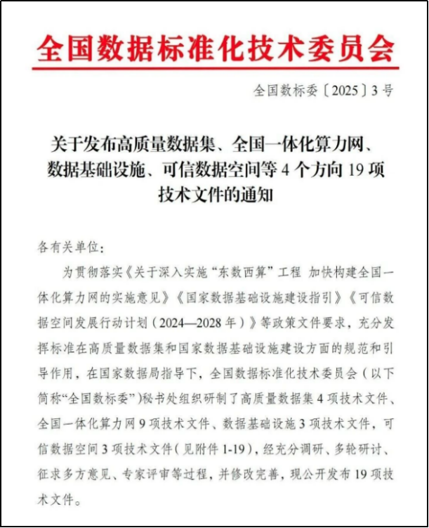 近日,在国家数据局指导下,全国数据标准化技术委员会秘书处组织研制了数据基础设施3项技术文件,可信数据空间3项技术文件,共6项技术文件。