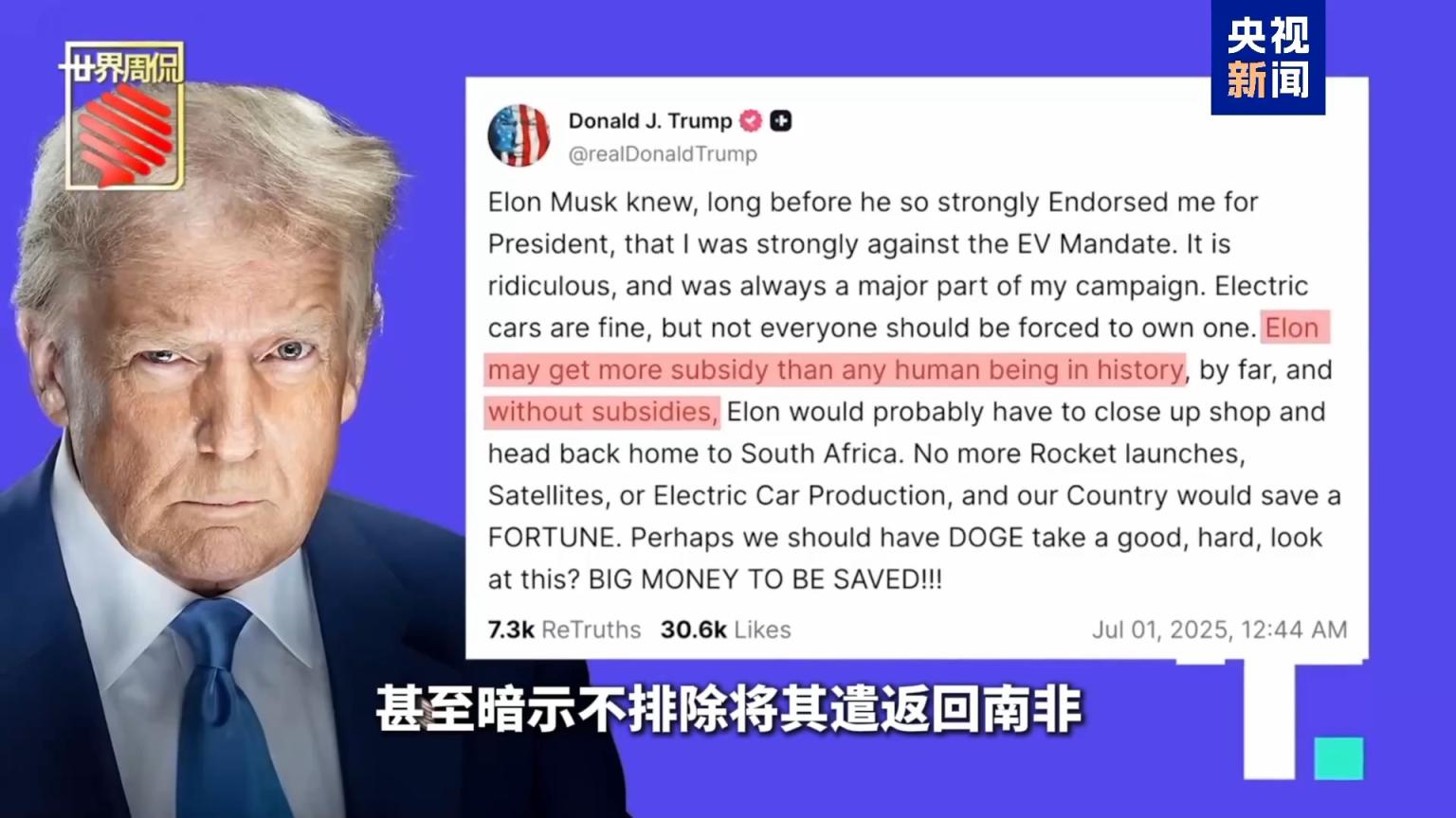 而特朗普则在“真相社交”上回怼称马斯克“是靠联邦补贴起家的吸血鬼”,甚至暗示不排除将其“遣返回南非”。