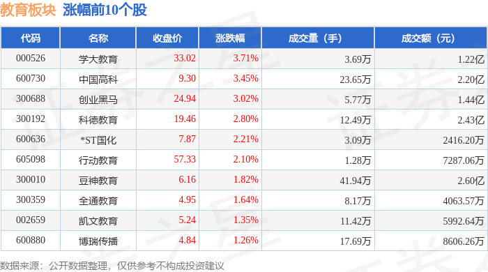 证券之星消息,4月10日教育板块较上一交易日上涨1.78%,学大教育领涨。当日上证指数报收于3986.22,上涨0.51%。深证成指报收于14309.47,上涨2.24%。教育板块个股涨跌见下表:
