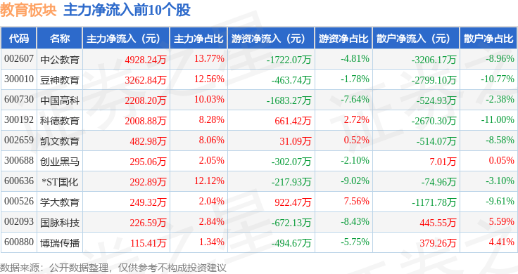 从资金流向上来看,当日教育板块主力资金净流入1.18亿元,游资资金净流出3444.45万元,散户资金净流出8342.21万元。教育板块个股资金流向见下表:
