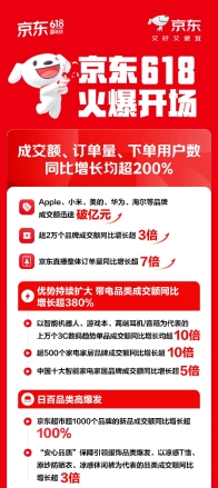 5月30日晚8点,真正的京东618正式开启,在诚意的补贴优惠与礼遇消费需求带动下,美妆、黄金珠宝、钟表眼镜、奢侈品、箱包配饰等品类迎来高增长。京东618开门红1小时,黄金镶钻饰品、瑞士表增长超10倍,水晶手串、行李箱、美妆礼盒等增长均超3倍,超500个美妆品牌、超100个箱包配饰品牌增长翻倍,蒂芙尼、宝格丽、迪奥增长超5倍。