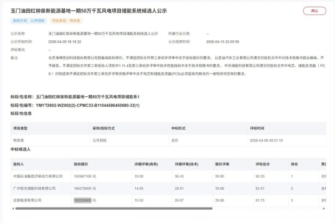 北极星储能网讯:2026年4月9日,甘肃玉门油田红柳泉新能源基地一期50万千瓦风电项目储能系统采购中标候选人公示,前三名中标候选人依次为中国石油集团济柴动力有限公司、广州智光储能科技有限公司、远景能源有限公司。