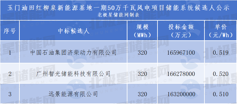第三中标候选人:远景能源有限公司,投标报价16320万元,折合单价0.510元/Wh。